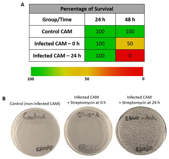 (A) Percentage of embryo survival after CAM infection (infected CAM) with 105 cfu/mL inoculum compared to non-infected CAMs (control CAM). Streptomycin was applied either at the time of inoculation (0 h) or 24 h after inoculation (24 h). Results show average (n = 2 per group). (B) Representative images of LB plates showing S. aureus colony formation after plating allantoic fluid samples (105 dilution). No colonies were observed in the control group plates. As can be observed, there were too many colonies to perform a count and subsequent quantification, which could only be done using a higher dilution.