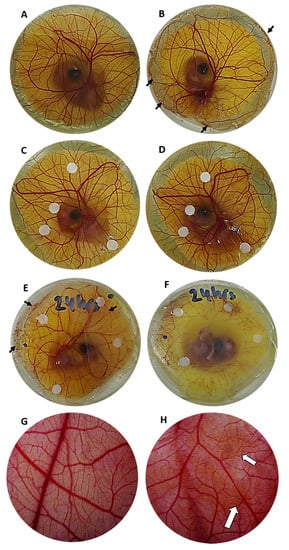Non-infected CAMs showed a well-defined network of blood vessels with no obvious pathological features (Figure 5A,G). On the other hand, CAMs with signs of infection showed various degrees of blood vessel damage, which was mainly observed on the periphery of the CAM, as well as throughout the network (Figure 5B,E). In some instances, the blood vessel network appeared quite disrupted, making it not suitable for further biomaterial testing (Figure 5E). However, some infected embryos showed minimal blood vessel network disruption (Figure 5B). Microscopic analysis showed a cloudy background for infected CAMs (Figure 5H) compared to non-infected CAMs (Figure 5G). Application of streptomycin at the time of inoculation seemed to clear infection because no evident signs of it could be observed for the majority of these CAMs (Figure 5C,D) compared to applying the antibiotic 24 h after inoculation (Figure 5E). When embryo death occurred, the CAM blood vessel network appeared completely destroyed (Figure 5F).