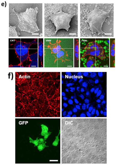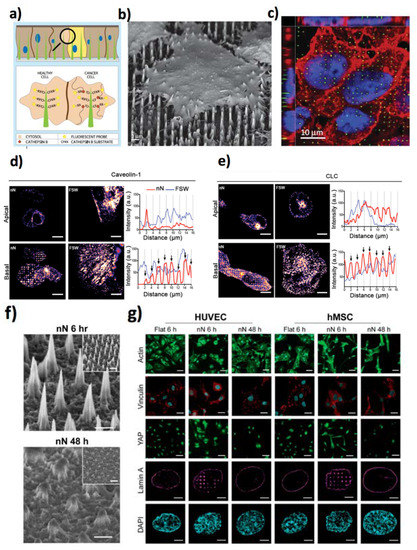 Si NWs have found applications for payload delivery, thanks to their permeability to the cellular membrane [44]. In 2016, Zimmerman et al. studied the cellular uptake of freestanding Si NWs [45] on human umbilical vein endothelial cell (HUVEC) and human aortic smooth muscle cell cultures. Andolfi et al. showed that high aspect ratio Si NWs control the mouse embryonic fibroblasts adhesion and cytoskeleton organization [46] by employing single-cell force spectroscopy to measure the adhesion strength down to pN resolution. In contrast to flat surfaces, the cell morphology and the organization of its cytoskeleton showed striking differences, since cells on Si NWs had a high number of filopodia and decreased mobility, along with a decreased proliferation after 36 h. Chiappini et al. [47] employed biodegradable Si NNs (having a 5 µm height, 1 µm pitch and <100 nm tips) for intracellular delivering of DNA and small interfering ribonucleic acid (siRNA). The NNs were leveraged to transfect in vivo the vascular endothelial growth factor (VEGF-165) gene, triggering neovascularization and localized blood perfusion in the target region of the muscle. The same kind of Si NNs were used to map the cytosolic cysteine protease Cathepsin B (CTSB) enzymatic activity in mucosa of the human esophagus [48]. NNs interfaced the cytosol of cells where active CTSB causes the cleavage of its Cathepsin B peptide substrate (CFKK), releasing the linked carboxytetramethylrhodamine fluorescent probe in the cell cytosol. The higher the CTSB activity, the higher was the fluorescence signal in the cytosol (Figure 2a–c).