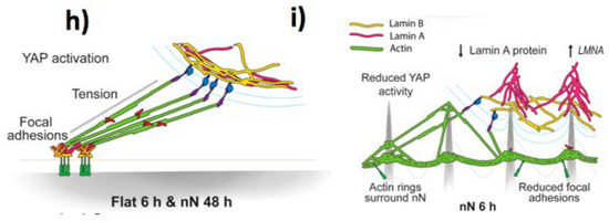 Recently, porous Si NNs [49] have shown the possibility to induce endocytosis, and deliver siRNAs into human mesenchymal stem cells (hMSCs). The NNs favoured the uptake of endocytosis biomolecular markers, along with micropinocytosis (Figure 2d,e). The Si NWs-induced cues permit to regulate the hMSCs fate [50]. Spherical morphology was observed for the hMSCs cultured on Si NWs and a 10% cell viability loss compared to those grown on flat Si supports. The shortest Si NWs triggered a higher expression of the osteogenic gene of type I collagen and runt-correspondent transcription factor 2 in comparison to the longer Si NWs and 2D flat Si. As another important example, Si NPLs arrays with diameters of 40–200 nm, obtained by the block copolymer colloids self-assembly, were used as efficient biointerfaces for differentiating hMSCs [51]. Si NWs have also found important applications in the field of neural stem cells (NSCs). Indeed, they can favour the differentiation of NSCs in neurons [52]. Kim et al. have shown the possibility to create strong contact between neurons and silicon nanocolumns (NCs) [53], retaining cellular integrity and the generation of neurites. To target mechanoresponsive elements inside HUVEC and hMSC cells, Hansel et al. [54] synthesized mesoporous Si NN arrays interfaces. They observed that NNs reduced the number of focal adhesions, decreasing the cytoskeletal stress, and remodelling the nuclear envelope at the contact sites (Figure 2f–i).