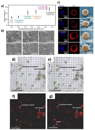 Single cell capture onto Si 1D structures. (a) NWs length-dependent triggered improvement of prostate cancer cell line (PC-3) capture. Fr-S stands for frosted slide, and Fr-S-SNW stands for SiO2 NWs-decorated slides at different NW lengths (0.5–2.5 µm). (b) Corresponding SEM images of the captured cells. (c) Immunofluorescence images staining (at the left and the centre) by nuclei DAPI and actin TRITC-phalloidine staining, and SEM images (at the right) of the captured PC-3 cells. Reprinted with permission from ref. [56] Copyright (2018) American Chemical Society. (d,e) Optical images, and (f,g) fluorescent microscopy images of Chlamy cells inkjet printed onto Si NWs, at 230 min (panels (d) and (f)), and at 300 min (panels (e) and (g)), showing core-inserted, cytoplasm-inserted, and non-inserted cells. Reproduced with permission from ref. [67] Copyright © 2016 by WILEY-VCH.