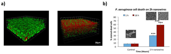 This mechanism was ascribed to the peculiar differences between bacterial and eukaryotic cells upon interacting with the 1D nanomaterials. Whereas the Young’s modulus of stem cells is in the range of 0.09 to 50 kPa, the bacterial cells show higher values, which result in more rigid cellular membrane and hence, easier rupture. Medina-Cruz et al. showed an intriguing synergic antibacterial activity by combining Ti NCs and Te NRs [91]. Ti NCs of different heights (150 nm and 300 nm long columns, tilted 20° and 40° from the normal, respectively) were synthesized by sputtering, showing antibacterial activity while maintaining the viability of human fetal osteoblastic cells. Upon functionalization with Te NRs, an enhancement of the antibacterial properties was observed, especially for the longest NCs. Although Te nanostructures themselves feature bactericidal effects, their combination with a nanocolumnar surface, which greatly reduces the bacteria adhesion as well, resulted in a synergetic enhanced bactericidal surface. In other reports, Tsimbouri et al. [92] proved that TiO2 NWs (average height of 1 μm and 25 nm in diameter) synthesized by a hydrothermal approach on Ti substrates supported the growth of osteogenic cells without stimulating osteoclast response, and reduced the viability of P. Aeruginosa bacteria (Figure 4a,b). In subsequent work, Bhadra et al. demonstrated that TiO2 can interact with bacterial cell walls (P. aeruginosa and S. aureus) leading to modest antibacterial behaviour [93]. Similarly to the paper of Tsimbouri et al. [92], the greater activity was ascribed to the gram-negative P. aeruginosa which had cell walls that were more easily deformed in comparison to the Gram-positive S. aureus. An effective bacteriostatic behaviour was demonstrated by Nataraj et al. on S. aureus by using a porcine skin model [94]. The authors found out that TiO2 NWs (about 100 nm in diameter) had higher antibacterial activity in comparison to TiO2 NPs (about 80 nm in diameter). It was possible to observe a concentration-dependent partial inhibition of S. aureus growth up to 4 wt % TiO2 NPs, whereas TiO2 NWs completely inhibited the growth. The reason for this different efficiency was explained by considering that, whereas NPs very easily aggregate, the NWs were better dispersed, leading to a higher anti-staphylococcal activity.