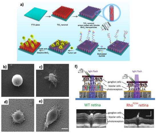 TiO2 1D materials have been employed for other important applications. Li et al. [101] prepared surfaces based on TiO2 NRs by hydrothermal method and coated with transparent MnO2 NPs for the high-efficiency capture of CTCs (EpCAM-positive SW480 and MCF-7 cancer-cell lines—see Figure 5a–e). The surfaces were functionalized with 3-mercaptopropyl trimethoxysilan, N-maleimidobutyryloxysuccinimide ester and streptavidin (SA). In turn, the biotinylated anti-EpCAM was conjugated onto the SA-coated substrate. The EpCAM-positive cells were captured with very high efficiency (up to 92.9%), subsequently released at a very high release efficiency (89.9%) by treating the MnO2 NPs with oxalic acid to dissolve them from the platform, whilst not compromising cellular viability. Tian et al. [102] demonstrated that TiO2 NFs conjugated with various neurotherapeutic agents permit the efficient treatment of spinal cord injury. The neuroprotective activity of NF mediated compound delivery was ascribed to the reduced bioavailability or sustained drug release [103]. The TiO2 NWs administered together with rat MSCs facilitated the neuroprotection in diabetic rats under hyperthermia conditions [104] subjected to a blood–brain barrier breakdown. Whereas the administration of rat MSCs (1 × 106) to diabetic rats slightly reduced the brain injury, TiO2 nanowired MSCs led to complete neuroprotection. The same group investigated the nanowired delivery of MSCs and cerebrolysin (a mixture of neurotrophic peptides) evaluating their effects on Alzheimer diseases in the rat model [105]. The TiO2-nanowired MSCs (106 cells) in synergy with cerebrolysin increased the level of neprilysin, the key enzyme for beta amyloid peptide degradation. Interestingly, the combination of TiO2 NWs with MSCs and cerebrolysin was able to pass the blood–brain barrier. Research efforts have also explored some exciting applications in the field of neural stimulation and artificial retinas. TiO2 NTs doped with polyaniline were employed for nerve cell growth [106]. Polyaniline was deposited on TiO2 NTs by electrooxidation of aniline, improving TiO2 antibacterial activity, reducing the charge transfer resistance, and improving the anticorrosion properties. Indeed, S42 Schwann cells and PC12 cells on such scaffolds show improvement in proliferation, differentiation, and axonal growth. Tang et al. [107] fabricated an artificial photoreceptor at the interface with blind mouse retinas based on an oriented Au NPs-decorated rutile titania (Au-TiO2) NW array to induce light-triggered activities in the primary visual cortex in vivo, and pupillary light reflex in awake-behaving mice. Although promising, it is still not clear if this approach enables the space and time-dependent control for artificial retinas. In this regard, Ronzani et al. [108] have recently demonstrated that TiO NTs can greatly stimulate the functionality of healthy and blind retinas (Figure 5f). The authors placed films of anatase TiO2 NTs adhered with photoreceptors (mouse retinas) or with bipolar cells (rhodopsin P23H mouse retinas, which permits to model retinitis pigmentosa), observing that the 1D nanomaterials stimulated the retinal network up to the video rate frequencies (25 Hz), in response to micrometre sizes light spots. They showed the possibility to modulate the spot size, duration, and localization.