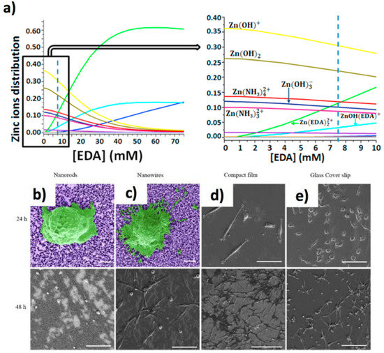 ZnO 1D nanostructures are biocompatible [109], and can be easily functionalized given the presence of –OH groups at their surfaces [110]. The synthesis of ZnO can be carried out by vapour [111,112] or by low-temperature wet-chemistry approaches [83,113]. In contrast to chemical vapour approaches, which require high-temperatures, wet-chemistry methods can be carried out at low-temperatures (<90 °C) [112]. However, conventional wet synthetic methods might lead to poor reproducibility. To solve these issues, our group has developed a wet-chemistry fabrication strategy of ZnO NWs based on numerical modelling [16], revealing the optimal concentration of ethylenediamine, a zinc-binding molecule, to grow thin NWs at alkaline pHs (8.9–9) [114]. As a result, it was possible to control the precipitation of ZnO by favouring the synthesis of long ZnO NWs (>15 μm), and high aspect ratio (>200) (Figure 6a).