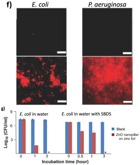 Such intriguing cell-dependent toxicity effects stimulated researches also in the field of antibacterial properties. Similarly to TiO2, ZnO materials have also been employed as an efficient photocatalyst and consequently as antimicrobial agents [135]. For instance, Okyay et al. [136] investigated the toxic effects of ZnO NRs against B. subtilis and E. coli, also finding no significant toxicity to fibroblast cells. The authors found that the main anti-microbial mechanisms of ZnO NRs could be explained as a result of the production of H2O2 and bacterial cell membrane disruption. On the contrary, ZnO NPLs (about 1 µm long, and 120 nm in diameter) coated Zn foils exerted superbactericidal effects on E. coli (ATCC8739) [137], resulting from the superoxide ions release from the ZnO coating (Figure 6f,g).