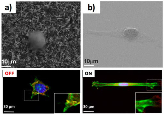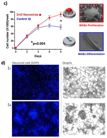 In general, ZnO NW based biointerfaces have cell-specific viability/toxicity which is partially dependent on the leakage of Zn2+ ions in the culture medium, and on the different morphologies and geometries of the 1D structures. As a consequence, it remains challenging to give a unified view concerning the biological effects of 1D ZnO material. Indeed, many literature reports showed a quite complex scenario, which lacks a clear recapitulation. For example, ZnO 1D materials are safe to Hela cells [115], human Caco-2 enterocytes [116], human dermal fibroblasts [117], and osteoblasts, as shown by Zong et al. [118], Lin et al. [119], and Park et al. [120]. These cells exhibited improved adhesion, proliferation, differentiation, and growth on ZnO nanoflowers. However, other reports evidence lack viability in the case of RSC96 Schwann cells [121], MCF7 and HaCaT cells [122], MRC5 cells [121], neonatal rat cardiomyocytes [123], mouse calvarial cells [124], and other cancer cells such as HepG2 and Caski [125,126]. Similar lack of viability was observed for murine macrophages and human monocyte macrophages, respectively due to mechanical stress leading to necrosis [127] and ZnO NW intracellular dissolution in acidic pH [128], respectively. As a remarkable example, Ghaffari et al. [129] found that ZnO dissociation in the cell culture media prompted the release of zinc ions that modified the adhesion and viability of neuron-like PC12 cells (Figure 6b–e), observing cytotoxicity. Similar negative effects were found by Wang et al. [130] on NG108-15 neuronal cells, HL-1 cardiac muscle cells, and neonatal rat cardiomyocytes. Recently, Raos et al. showed that ZnO NWs [131] promoted the growth of human neuronal cells if the NWs were short (<500 nm) and packed (>350 NWs/µm2). On the contrary, ZnO NWs of higher length and lower density inhibited neuronal adhesion. The herein complex effects of the ZnO based biointerfaces were tentatively explained by Wang et al. [123] by considering that ZnO 1D materials at high density inhibit cellular adhesion, resulting in the loss of viability for fast dividing cell lines [130], whereas the lack of adhesion could still be tolerated by primary cells [132]. Moreover, ZnO 1D materials can also remove a thin solution layer below the cells, simply because the cell culture media tends to fill the spaces between the NRs due to capillary effects [133,134] thus limiting the diffusion of nutrient and oxygen to the cell, and resulting in cell death.