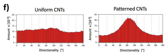 CNT applications in bioelectronics interfaces. (a) Electrically-driven soft robot composed of a PEG hydrogel substrate, covered by gelatin methacryloyl (GelMA) with dispersed CNTs (b) SEM characterization of the CNT–GelMA hydrogel. (c) The quasi-3D structure of the cardiac muscle tissue is constituted of four layers. (d) The corresponding confocal fluorescent images show different morphology in each of the systems. Reproduced with permission from ref. [156] Copyright © 2018 by John Wiley and Sons, Inc. Reprinted with permission from John Wiley and Sons, Inc. (e,f) The formation of a neural connection onto CNTs (top panels), and onto silicon decorated with patterned CNTs (15 µm pitch, 7.5 µm width) (bottom panels). DAPI staining for nuclei (in blue), Glial fibrillary acidic protein (GFAP) for astrocytes (in green), and β-tubulin III for neurons (red). At the left, uniformly distributed CNT carpet lead to homogeneous cellular distribution, at the right high directionality for the patterned CNTs. Reproduced with permission from ref. [158] Copyright © 2018 by WILEY-VCH.