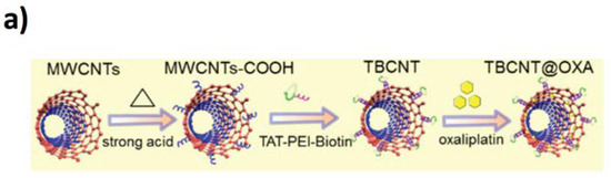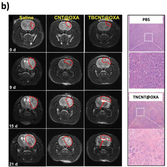 CNTs are also ideal drug delivery systems, given the possibility to functionalize their surface with biomolecules both covalently and non-covalently [166], facilitating the dispersibility of the CNT-drug complex in the biological fluids reaching the biological target. Gangrade et al. recently demonstrated an elegant drug delivery system containing an injectable CNT impregnated silk-based hydrogel [167]. In particular, they realized a composite made of silk protein and SWCTNs modified with doxorubicin permitting a sustained release within a 14-day study. In an interesting paper, You et al. showed a protocol of functionalization MWCNTs for orthotopic glioma therapy [168]. They used streptavidin-biotin coupling chemistry to functionalize the MWCNTs with the cell-penetrating peptide (TAT-PEI-Biotin) and oxaliplatin (OXA), obtaining the TBCNT@OXA system for in vivo targeting of gliomas (Figure 9a,b).