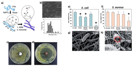 Accordingly, 1D polymeric materials can be loaded with active antibacterial substances to exert a synergic effect. For example, Song et al. [210] prepared poly[2-(tert-butylaminoethyl) methacrylate] (PTBAM) cationic polymer NFs by radical-mediated dispersion polymerization, and embedded them with 8 nm-sized Ag NPs to exert bactericidal effects (Figure 11a–d). Some examples report on the encapsulation of Ag NPs within organic polymers, such as polyacrylonitrile fibres [211] (diameter comprised between 270 and 400 nm), and electrospun cyclodextrin NFs [212] (diameter around 200 and 400 nm), onto which Ag NPs were synthesized (cyclodextrins acted as reducing agents). In addition to Ag NPs, many reports also show the possibility to load antibiotics and bioactive compounds on the fibres. As an example, Kuntzler et al. developed a protocol to produce bactericidal electrospun NFs (about 200 nm in diameter) containing chitosan/PEO blend and phenolic compounds [213]. In other reports, interesting antibacterial activities were observed in poly(caprolactone)/poly(vinyl alcohol) core-shell NFs loaded with Thyme extracts [214] in PCL fibres on which gentamicin was immobilized [215] and also in nylon polymeric NFs membranes impregnated with Texas sour orange juice [216]. These materials all had diameters around 200–400 nm. Finally, it is worth mentioning the finding of Mayerberger et al. [217] who encapsulated Ti3C2Tz (where T is a variable surface termination such as OH, F, O, Cl) nanoflakes into electrospun chitosan NFs (diameters spanning in the 230–280 nm range) by crosslinking with glutaraldehyde. The authors observed that a Ti3C2Tz concentration as little as 0.75 wt % can induce bactericidal effects on E. coli and S. aureus (Figure 11e–h).