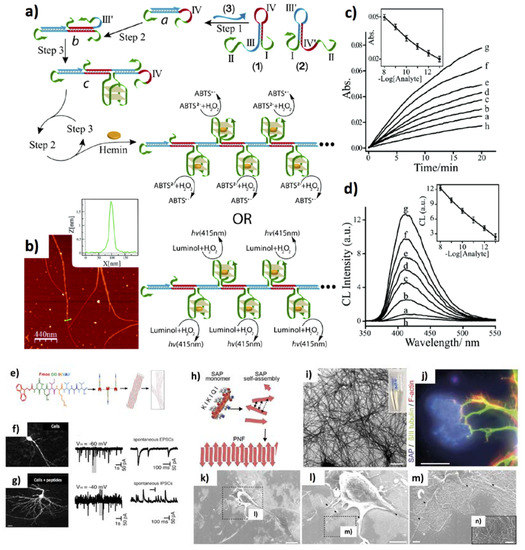 1D self-assembled DNA and peptides materials. (a) Target DNA recognition by two hairpins triggers the formation of DNA NWs. (b) AFM characterization and height analysis (inset) of the DNAzyme NWs. (c) Variation of ABTS− absorbance as a function of time, at increasing DNA target concentrations in the range from 0 to 10 nM: (a) 0 M, (b) 10−4 nM, (c) 10−3 nM, (d) 10−2 nM, (e) 10−1 nM, (f) 1 nM, and (g) 10 nM. (d) Characterization via chemiluminescence spectra. Reprinted with permission from ref. [221] Copyright (2012) American Chemical Society. (e) The Fmoc-DDIKVAV peptide self-assembling in 1D structures by π-interactions of the Fmoc groups and the hydrogen bonds from the DDIKVAV peptide chains forming β-sheets, leading to a fibrous assembly. In (f,g) enhanced neuronal phenotype and synaptic connectivity of human embryonic stem cells implanted with peptide fibres into the ischemic brain. Scale bars are 20 µm. Reprinted from ref. [232] with permission from Elsevier. (h) Networks of self-assembling peptide NFs for neuronal cell adhesion. (i) TEM (scale bar is 600 nm), and (j) fluorescent microscopy (scale bar is 20 µm) images of peptide NFs forming plaques (blue) turning as adhesion points for nerve fibres (green). (k–n) SEM pictures of primary neurons peptide NFs (scale bars are 100 µm, 50 µm, 10 µm, and 5 µm, respectively), forming cellular protrusions (see the insets). Reproduced with permission from ref. [233] Copyright © 2019 by WILEY-VCH.
