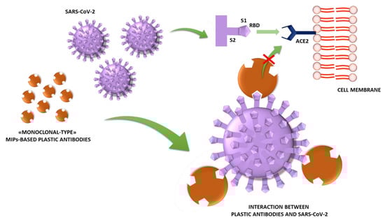 Schematic representation of the interaction between Molecularly Imprinted Polymers (MIP)-based “monoclonal-type” plastic antibodies and SARS-CoV-2 (Severe Acute Respiratory Syndrome Coronavirus 2).