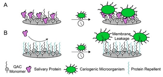 Dual functional dental materials enable contact-killing of cariogenic microorganisms by repelling proteins and disrupting bacterial membranes via charged interactions. (A) Salivary proteins adsorb to quaternary ammonium-containing (QAC) monomers, inhibiting their long-term antimicrobial properties. (B) Protein-repellent molecules work with QAC monomers to disrupt the formation of biofilms.