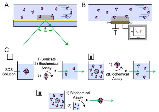 QCM devices implement a piezoelectric functionalized substrate [,,]. When a current is applied to the substrate, the material vibrates at a frequency proportional to its mass. The piezoelectric material surface is coated or chemically bonded with a material of interest, to probe how much protein adsorbs to the material surface. These substrates are incorporated into microfluidic devices that flow protein solutions onto the substrate surface and are coupled with real-time sensing. When proteins adsorb onto the substrate, the frequency at which it vibrates changes. This change in frequency is converted to the mass of protein adsorbed to the substrate. QCM can be used to yield dynamic properties of adsorbed proteins, such as revealing changes to the salivary pellicle on hydroxyapatite surfaces when various detergents are flowed over the substrates []. In addition to monitoring protein adsorption, QCM has been used to probe the formation of biofilms and bacterial death in a clinically relevant microorganism model []. SPR and QCM techniques are useful for protein interactions with high-density surfaces and are best for studying low adsorption, as they saturate with milligram quantities of protein.