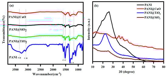 (a) FTIR spectra of the polymer composites and (b) XRD pattern for the PANI composites of PANI-CuO, PANI-TiO2, and PANI-SiO2.