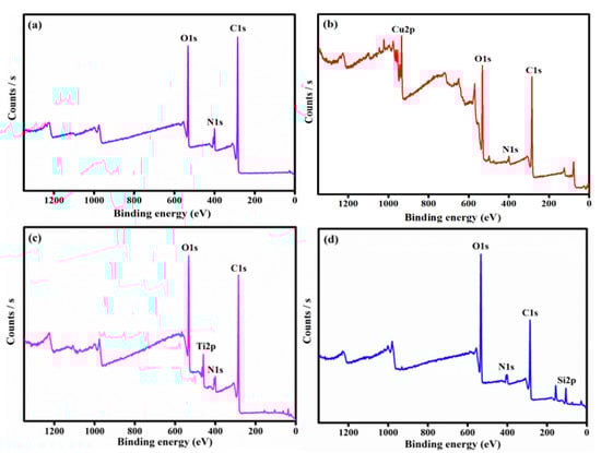 The presence of C, N, O, and metal ions of Cu, Ti, and Si was observed from the composite XPS spectra as shown in Figure 3. Three new peaks at 838, 123.79, and 886 eV emerged after the adsorption process.