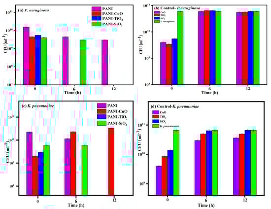 Both PANI-CuO and PANI-TiO2 completely suppressed the growth of PA after 6 h of its exposure to these two composites. The PANI-SiO2 required up to 12 h to eradicate the growth of this bacterium, whereas PANI exhibited a modest antimicrobial effect on PA (Figure 4a). All pure three oxide particles exhibited no antimicrobial activities against PA (Figure 4b). Surprisingly, PANI-CuO showed no antimicrobial activity against KP, whereas PANI-TiO2 completely suppressed the growth of KP after 6 h of exposure (Figure 4c). The growth of KP was not affected by PANI-SiO2 or PANI during the first 6 h incubation but succumbed after 12 h of exposure (Figure 4d).