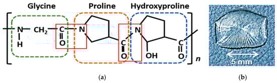 α helix consisting of Gly-Pro-Hyp unit connected by a peptide linkage marked with red squares (a); picture of the collagen film obtained from a tilapia’s scale (b).