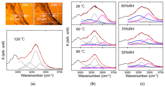 In order to clarify the hydration state, we have extracted the contribution of O–H stretching vibration in water molecules from Figure 2a,b. At 120–180 °C, the absorbance spectrum is unchanged, and the sample is damaged a little. In the upper pictures of Figure 3a, the sample shape alters above 190 °C because of a denaturation. We have used the spectrum at 120 °C to evaluate the contribution of collagen molecules. The spectrum at 3000–3750 cm−1 in the lower figure of Figure 3a is reproduced with a red curve that is the sum of four Lorentzian curves (grey curves). Those components originate from the stretching vibration of C–H, N–H, and O–H groups in the collagen molecule. Those results (grey curves) are used for the deconvolution in Figure 3b,c. As a consequence, we have confirmed the two O–H stretching bands (blue and purple Lorentzian curves), each integrated absorbance of which is almost equivalent, and reveals identical dependence on temperature and RH. The integrated absorbance reflects the number of water molecules hydrated around the collagen molecule. With the use of resonance frequencies of 3200 and 3500 cm−1 at 26 °C, the average O–O distances related to a hydrogen bond are estimated as 2.71 and 2.90 Å, respectively [31,32]. Those values are slightly different from the O–O distance in ice (2.75 Å) and free water (2.85 Å) [33,34]. The water molecule corresponding to the 3200-cm−1 band is strongly hydrogen bonded to collagen and adjacent water molecules. On the other hand, the 3500-cm−1 band implies that the water molecule possessing a nearly-free O–H is connected with extremely weak hydrogen bonds. The band width for those bands is rather broad in all the temperature ranges, and then the O–H stretching vibration may have an anharmonic coupling to the other vibrational modes.