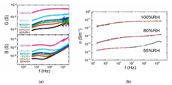 RH dependence of the complex admittance at 26 °C. (a) Conductance (G) and susceptance (B) for 55–100% RH; (b) the frequency dependence of ac conductivity fitted with red curves on the basis of Cole-Cole type relaxation.