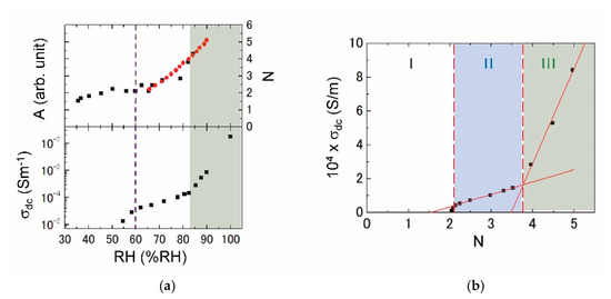 According to the measurement on weight change, we have evaluated the hydration number per unit (N). The upper figure of Figure 5a shows the RH dependence of N (red circles) incorporated with the sum of integrated absorbance (black squares) due to two different hydration states (blue and purple curves in Figure 3c). The hydration of N = 2 changes a little for 50–65% RH, but is slightly reduced below 50% RH. If the N is approximated to a linear increase above 90% RH, we may estimate that N ~ 7 at least for 100% RH from the extrapolation. The lower figure of Figure 5a shows the RH dependence of σdc. The slope changes for 60% RH in agreement with the N just mentioned above. Moreover, σdc exhibits a remarkable increase above 83% RH.