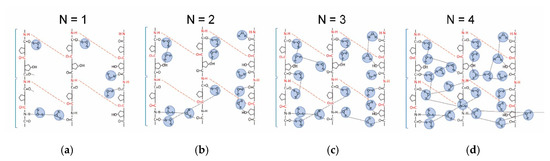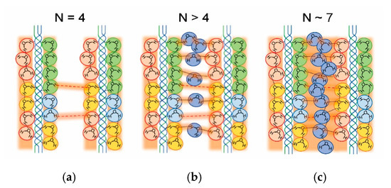 We would like to discuss how the water network develops in the collagen molecule on the basis of hydration structures studied previously [22,23,24,25,26,37,38,39,40,41]. The water molecule in the primary hydration shell definitely contacts to the N–H, O–H, and C = O groups through hydrogen bonds as well as in a collagen-like peptide. For N = 1, a water molecule is basically isolated as illustrated in Figure 6a, where a triple helix with a repeating sequence of Gly-Pro-Hyp is schematically extended on a plane. Red broken lines represent a hydrogen bond between N–H of Gly and C = O in the different peptide chain. For N = 2 (Figure 6b), a proton is fundamentally localized in a water bridge that is partially formed inside the helix. In this paper, a water bridge fundamentally confined in a triple helix is referred to as an intra-water bridge. A proton-transfer pass is hardly built for N < 2, and consequently σdc is extremely small in region I.