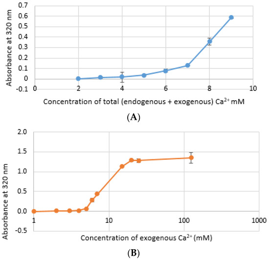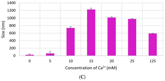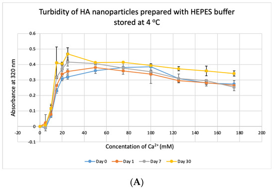 The pre-prepared CA stored at stored at +4 °C seemed to be degraded with time (Figure 9D), with significantly low absorbance for day-30 data. Pre-prepared CA stored at −20 °C and −80 °C gave significantly high absorbance from 1-mM Ca2+ compared to that for NP prepared with fresh buffer with statistical significance at p < 0.1 (Figure 9E,F). In a word, we can conclude that CA NP stored at +4 °C degrades with time. However, colder temperature supports increased particle formation.