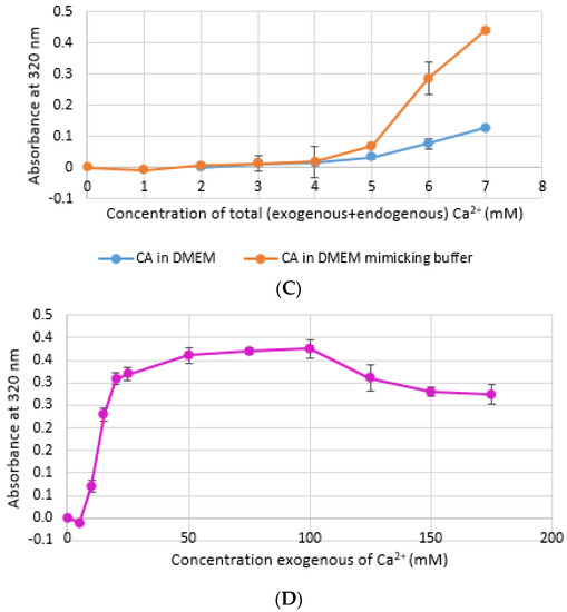 CA-in-DMEM, CA-in-DMB and HA were prepared with 4 µL, 6 µL and 10 µL from a 1-M stock of CaCl2·2H2O in 200 μL volume. After incubation, 800 μL DMEM, DMB or HBS of pH 7.5, 7.0 or 6.5-was added to the tubes. After 5 min, absorbance was measured at 320 nm.