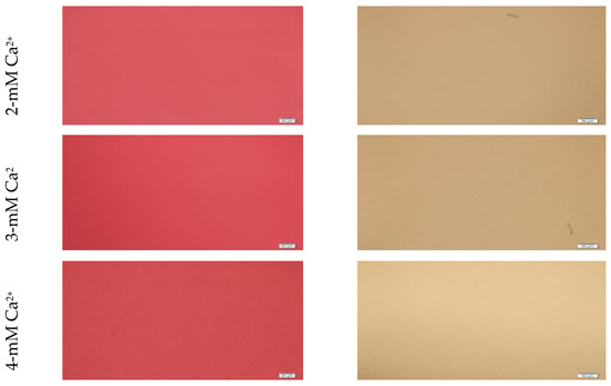 Microscopic images of CA-in-DMEM and CA-in-DMB (Figure 2) showed a similar trend of enhancement in particle growth. Immediately prepared CA-in-DMEM and CA-in-DMB were observed at 10× magnification under bright field using Olympus IX81 motorized inverted research microscope (Figure 2). With increasingly higher Ca2+ concentration, size and number of particles increased. Particles were visible under a microscope from 4-mM Ca2+ in DMEM and from 3-mM Ca2+ in DMB.