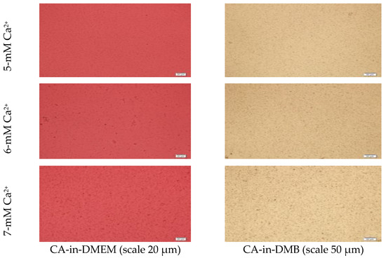 Microscopic images of CA-in-DMEM and CA-in-DMB. Particles prepared with different concentrations of total Ca2+. Visible particles started to form with a minimum 3 mM of Ca2+ in DMB, while in DMEM, they started at 4 mM of total Ca2+.