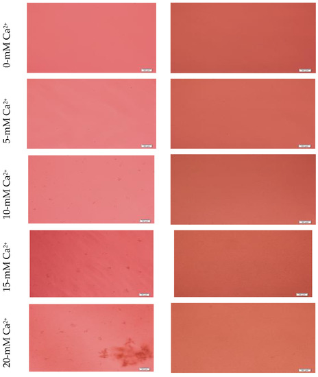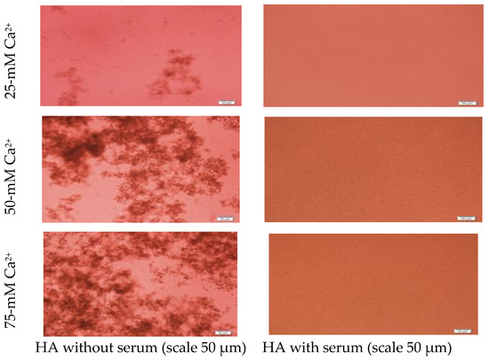 Formation of HA NPs increased up to 50 mM of Ca2+, maintaining a plateau up to 100 mM of Ca2+, followed by a drop in absorbance due to sedimentation (Figure 1D). For microscopic observation, HA particles were diluted in DMEM (Figure 3). Particles were small, aggregated and sedimented with increasing Ca2+ concentration in serum-free media. HA particles had a tendency to aggregate and sediment, which caused a drop in absorbance value after 100 mM of Ca2+. In serum-containing media, small HA particles were homogenously dispersed, which is probably due to binding of albumin and other serum proteins to the particles [27].