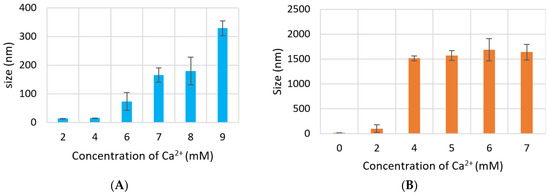 Size of CA increased proportionally with Ca2+ concentration. However, particle diameter increased only up to 350 nm with 7 mM of Ca2+ in DMEM (Figure 4A), while size of CA prepared in DMB drastically increased to 1500 nm with 4-mM Ca2+ and the size did not change significantly with further addition of Ca2+ (Figure 4B). HA NPs reached to a peak of 1200 nm with 15-mM Ca2+, after which size became smaller again (Figure 4C).