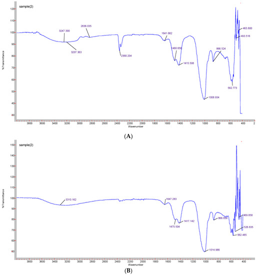 Formation of CA-in-DMEM and CA-in-DMB was confirmed by the presence of transmittance peaks for CO32− (1641, 1480, 1415, 866 cm−1 and 1647, 1475, 1417 cm−1) and PO43− (1008, 562, 1014, 526 cm−1). ATR for HA particles gave peaks for PO43−. For this nanoparticle, we also found few peaks for CO32− (1641, 874 cm−1), which could be due to incorporation of CO32− from atmospheric CO2. PO43− peak was wider for CA than that for HA due to CO32− incorporation in the lattice [28] (Figure 6).
