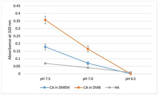 pH-dependent dissolution of CA-in-DMEM and CA-in-DMB and HA. Particles prepared in DMEM/buffers of pH 7.5 in 200-μL volumes and afterward mixed with 800 μL of DMEM/buffers of different pH values. Absorbance measured at 320-nm wavelength. Data show increased particles dissolution with decreasing pH.