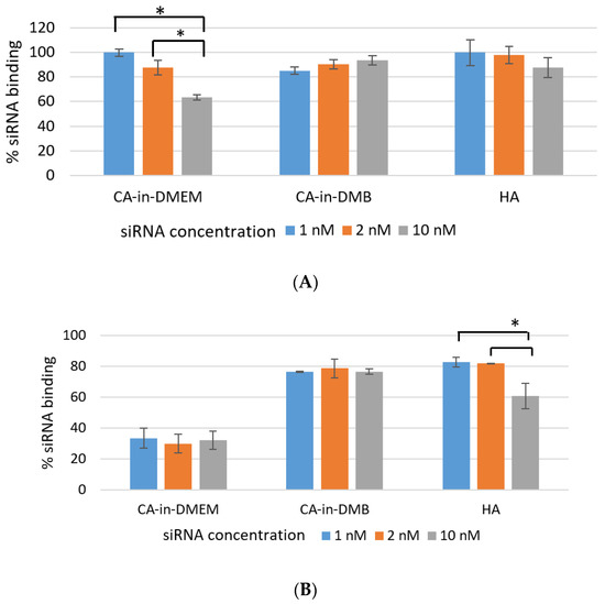 Efficiency of siRNA-binding to CA-in-DMEM, CA-in-DMB, and HA. After formulation, particles complexed with siRNA were centrifuged, followed by removal of supernatant. The pellets were (A) directly dissolved in 10-mM EDTA or (B) washed with water by another 15-min centrifugation before dissolving in EDTA. Concentrations of the siRNA bound to the particles were calculated from the formula in Section 2.9. CA-in-DMB and HA showed stable and high binding to siRNA. * indicates significant difference at p < 0.05.