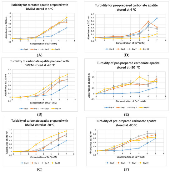 Stability of DMEM and CA-in-DMEM stored at different temperatures for different durations. (A–C) Absorbance of CA prepared with DMEM that was stored at 4 °C, −20 °C and −80 °C for 1, 7 or 30 days; (D–F) absorbance measured for prepared CA stored at 4 °C, −20 °C and −80 °C for 1, 7 or 30 days. Two-sample paired T-test performed for statistical analysis. For (A–C), compared to Day 0, all data were significant. For preprepared CA, compared to Day 0 data, particle formation was significantly higher when stored at −20 °C and −80 °C (E,F).
