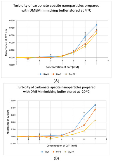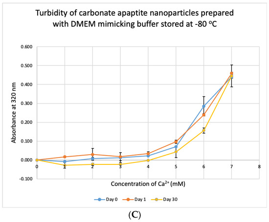 Stability of NPs at various storage temperatures in clinical setting is important for their practical usage. We tested the stability of bicarbonated DMEM for instant particle formulation and pre-prepared CA-in-DMEM. DMEM was prepared and stored for 1, 7 and 30 days at +4 °C, −20 °C and −80 °C. In addition, nine sets of CA were prepared in DMEM and stored at three temperatures for the three above mentioned durations. CA NPs prepared with DMEM stored at three different temperatures—+4 °C, −20 °C and −80 °C, gave higher absorbance than that for freshly prepared NPs (Day 0). CA prepared with DMEM stored at +4 °C gave similar absorbance after three time points (Figure 9A). However, while compared to day-0 data, day-1 and day-7 data were significant at p < 0.05, data for day-30 were significant at p < 0.1 and seems to produce less particles at low Ca2+ concentration. The absorbance increased with time for DMEM stored at-20 °C and −80 °C (Figure 9B,C). While the chart shows a pattern of higher absorbance indicating more particles, data were statistically significant at p < 0.5, with an exception for Day 0 versus Day 30 data for DMEM stored at −80 °C, which was very significant at p < 0.01.