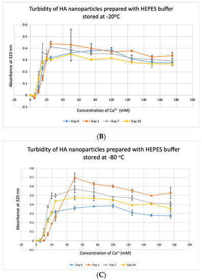 HBS buffer was stored at +4 °C, −20 °C and −80 °C for 1, 7 and 30 days and used to prepare NPs. HA prepared with HBS stored at 4 °C and −20 °C gave absorbance values, similar to that of freshly prepared particles (Figure 11A,B) and were not significantly different, except for day-30 data for HBS stored at +4 °C which was very significantly higher than day-0 data at p < 0.001. For HBS stored at −80 °C (Figure 11C), particle formation was significantly higher on Day 7 and Day 30, compared to that for fresh HBS on Day 0 (p < 0.01). We can consider that HBS can maintain its integrity at 4 °C for a duration smaller than 30 days and at −20 °C for 30 days.