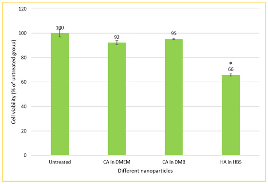 In vitro cytotoxicity of CA and HA in MCF-7 cell line. NPs prepared in 1-mL volume and diluted 10 times before adding to the cells seeded the day before. MTT assay performed after 2 days of treatment. * Compared to untreated groups, HA decreased cell viability significantly at p < 0.05 level.