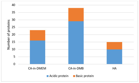 For the PC analysis, NPs were prepared as stated in Section 2.2, with 6 mM and 10 mM of total (endogenous + exogenous) Ca2+ for CA and HA, respectively, followed by a 30-min incubation at 37 °C with mouse plasma. The sample was centrifuged at 13,200 rpm at 20 °C for 15 min. The supernatant was then removed and replaced with 1 mL water, without disturbing the pellet. The sample was centrifuged a second time under the same conditions, and the supernatant was discarded. The precipitate was resuspended in 100 μL of 50-mM EDTA, followed by desalting with C18 spin column (Thermo Fisher Scientific, Waltham, MA, USA). Solvents were evaporated in a centrifugal evaporator (EYELA Centrifugal Evaporator CVE 3110, Tokyo, Japan). Proteins were subjected to trypsin digestion.