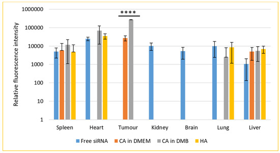 The signal was negative from kidney for all three NPs. On the contrary, systemic delivery of NPs loaded with siRNA resulted in substantial accumulation in the liver and spleen and organs of the reticuloendothelial system. Apart from free siRNA, CA-in-DMB and HA reached the lungs. Among the NPs and free siRNA there was no statistically significant difference in their levels in spleen, heart, lung and liver.