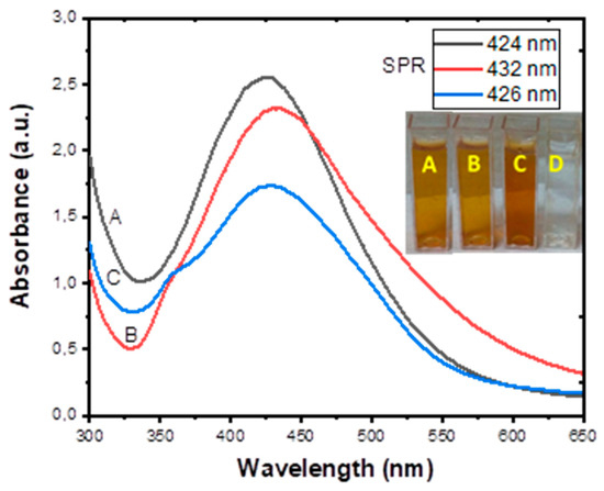 Absorption spectra of (A) Leucosidea sericea total extract-, (B) F1-, and (C) F2-mediated silver nanoparticles. The cuvettes labelled A-C (inset) represent the colour of the respective AgNPs while the clear solution (D) shows the colour of 1 mM AgNO3 solution used for the biosynthesis.