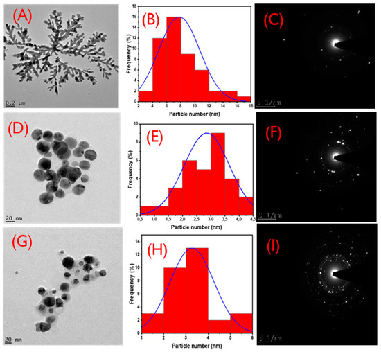 Figure 2A–F shows the HRTEM images, the corresponding particle size distributions, and SAED patterns of LSTE-, F1-, and F2-AgNPs. The average particle sizes were found to be 7.8 ± 2.9, 2.9 ± 0.8, and 3.3 ± 1.2 nm respectively. F1- and F2-AgNPs were more monodispersed and spherical in shape. Dendritic shapes, however, were observed for the LSTE-AgNPs (Figure 2A). This dendritic architecture has been previously reported [53,54]. Different shapes of silver NPs have been ascribed to a number of factors including the distance of formation to thermodynamic equilibrium and the fact that shape control for biological synthesis is still in its infancy [58]. Furthermore, spherical shapes were predominant for F1- and F2-AgNPs. The green synthesis of MNPs often results in nanoparticles of different shapes. The presence of a mixture of shapes such as irregular, triangular, hexagonal, and spherical is because of phytochemicals of different functional groups serving as reducing as well as stabilizing agents [59]. On the other hand, previous studies have shown that polyphenols in their pure forms often account for nanoparticles with spherical shapes, which were also observed in this study with F1- and F2-AgNPs [51,60]. Similar shapes and sizes have also been reported, in agreement with our findings [49,61]. Figure 2C,F,I depict the selected area electron diffraction (SAED) patterns of LSTE-, F1-, and F2-AgNPs respectively. The brightly circular patterns indicate that the particles are polycrystalline and can be indexed to the (111), (200), (220), and (311) planes of a face-centred cubic (FCC) structure of silver [51].