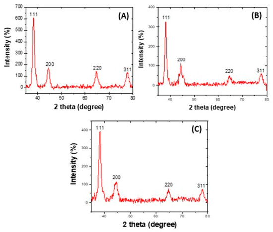Figure 3 displays the XRD markings of the AgNPs. The 2θ (degree) values of 38.2, 44.4, 64.6, and 77.5 correlate orderly with the (111), (200), (220), and (311) planes of a face-centred cubic (FCC) silver lattice [62], in agreement with the standard silver structure (JCPS no. 04-0783). The XRD decoration also indicated that the biosynthesized silver nanoparticles are crystalline. Further supporting evidence of crystallinity are given by the presence of bright spots observed in the SAED patterns in Figure 2.