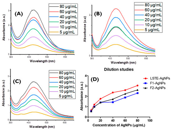 Since certain biological applications may require different concentrations of AgNPs, dilution studies are necessary to confirm the retention of properties before future utilization [40]. Figure 4 shows the UV-Visible results of (A) LSTE-, (B) F1-, and (C) F2-AgNPs. The absorption spectra obtained for the different concentrations of the nanoparticles (80, 60, 40, 20, 10, and 5 µg/mL) suggest that the SPR wavelengths are almost identical for all the solutions. This means that the dilution of nanoparticles does not affect the properties of LSTE-, F1-, and F2-AgNPs [40]. Furthermore, the study of intensity versus concentration affirmed a proportional relationship, as depicted in Figure 4D. The importance of this dilution study is in the dosage to be used for certain applications. For the prepared nanoparticles to be active at any given concentration, their physicochemical features need to be retained. One of the quickest ways to confirm this is through their absorbance in UV-Visible spectroscopy, a powerful tool in green synthesis. Thus, if there was no absorbance at the expected region, it may be inferred that the particles have lost their properties and may not be useful at such concentration. This serves as a guide for subsequent applications and consideration of another principle of green chemistry (atom economy).