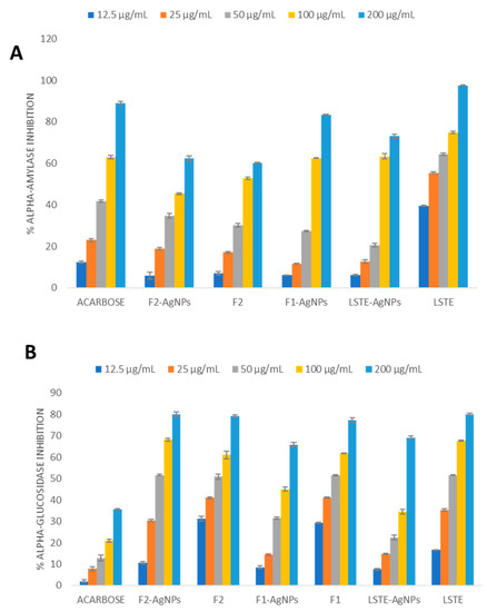 Antidiabetic activities with regards to alpha-amylase (A) and alpha-glucosidase (B) inhibition by Leucosidea sericea total extract (LSTE), procyanidin fractions (F1 and F2), and their respective silver nanoparticles (LSTE-, F1-, and F2-AgNPs).