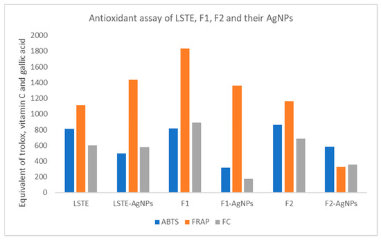 Antioxidants possess free radical scavenging abilities. Table 3 reports the scavenging ability of the three AgNPs biosynthesized from LSTE, F1, and F2 and the respective intact fractions. The antioxidant activities, as measured by the FRAP, ABTS, and FC assays, of the intact fractions were significantly (p < 0.01) higher than those of their corresponding AgNPs. For instance, when considering the ABTS assay, all the fractions, roughly showed a doubling of antioxidant activity when compared to the hybrid nanoparticles. This could be ascribed to a change in the functional groups during the nanoparticle formation, rendering them unavailable to participate in the scavenging activity with a subsequent reduction in the antioxidant activity. The antioxidant activity as the equivalence of the standard (Trolox, vitamin C, and gallic acid) for ABTS, FRAP, and FC assays respectively, has been shown in Figure 6.