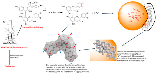 In our previous work, nuclear magnetic resonance (NMR) spectroscopy and liquid chromatography-mass spectrometry (LC-MS) aided the identification of F2, F1 and LSTE [40] contents. F1 showed a mixture of procyanidin dimers and trimers, while F2 showed a very pure isomeric structure of procyanidin dimers (type-B). On the other hand, the total extract (LSTE) showed in addition to procyanidins dimers and trimers, small flavonoids, and phenolic acids. Taking the B-type procyanidin dimers as an example (fraction F2), the mechanism of formation of AgNPs is demonstrated (Scheme 1). Following the green synthesis protocols, the starting materials were dissolved in ultrapure water. As water ionizes into protons and hydroxyl ions, the OH- abstracts a proton from one of the hydroxyl groups on the compound (e.g., procyanidin B3) and an alkoxide ion is generated. The alkoxide species then reduces the silver ion (Ag+) to Ag0, thereby generating the NPs, and since the oxidation products depend on the alkoxide precursor, quinones are formed (Scheme 1) [50].
