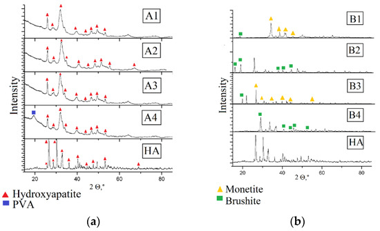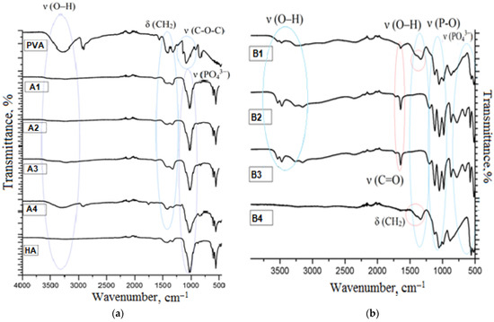 The analysis of the obtained composites showed that in the composite spectra, there were bands that were typical of both PVA and HA. For the composites obtained by method A, there are absorption bands typical of pure hydroxyapatite, as well as broad bands of weak intensity of bending vibrations of CH2-groups in the range of 1250–1400 cm−1. The –OH absorption band of the PVA group is observed only for composite A1 with 50 mass.% of PVA. The composites obtained by method B, have different transmittance spectra. Triple intensive bands in the range of 1000–1080 cm−1, corresponding to vibrations of phosphate groups, as well as broad bands from 3500 to 2250 cm−1, are typical of them. They represent associated absorption bands of hydro- and dihydrogen phosphate ions. Shifts and unique absorption bands were not found. This is evidence of the fact that formation of new chemical bonds between components does not occur in any of the methods. Crystals of calcium phosphates are retained on the surface of the polymer due to van der Waals interactions.