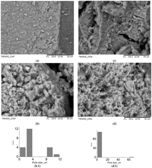 SEM-images of the materials surface: (a) A1, (b) A2, (c) A3, (d) A4, pore size distribution: (b.1) A2, (d.1) A4.