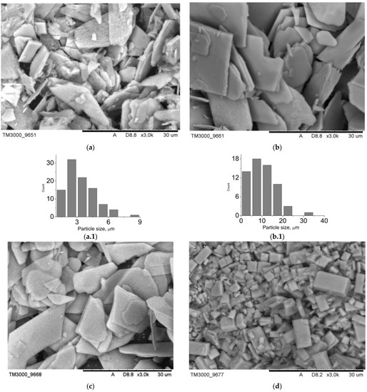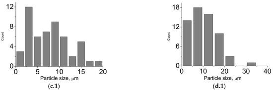 SEM-images of the materials surface: (a) B1, (b) B2, (c) B3, (d) B4; particle size distribution: (a.1) B1, (b.1) B2, (c.1) B3, (d.1) B4.